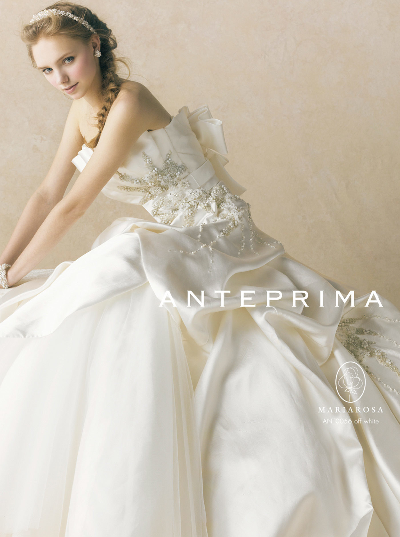 “ANTEPRIMA”の代名詞とも言える光のテクニックは繊細なビージングレースや軽やかに輝くグリッターとなってドレスに上品な華やかさを添えています。
