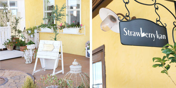 国道349号沿い、青い三角屋根と赤いポールのイチゴ柄看板が目印です。