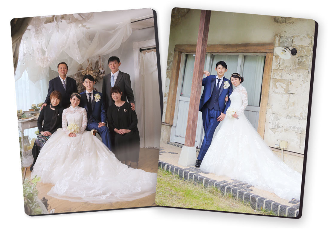 ご両家にプレゼントしても喜ばれる写真一体型のフォトフレーム。表面はアクリル貼りで高級感もあります