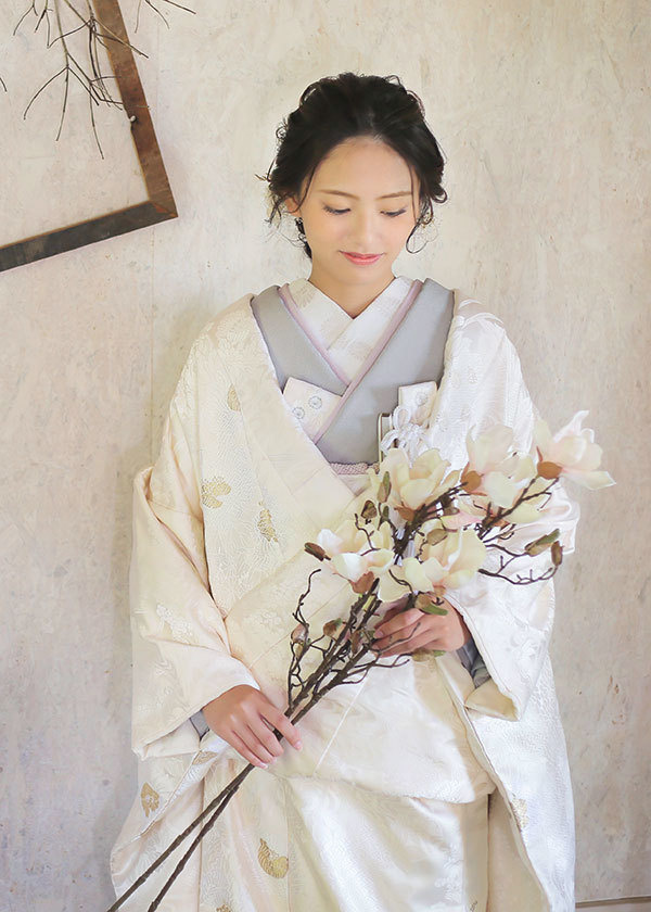 灰青色(はいあおいろ)と呼ばれる淡いグレーの色掛下(白無垢の下に着る着物)を合わせたコーディネート。トレンドのくすみカラーでまとめました。差し色として淡い紫をあしらって、華やかさをプラス。