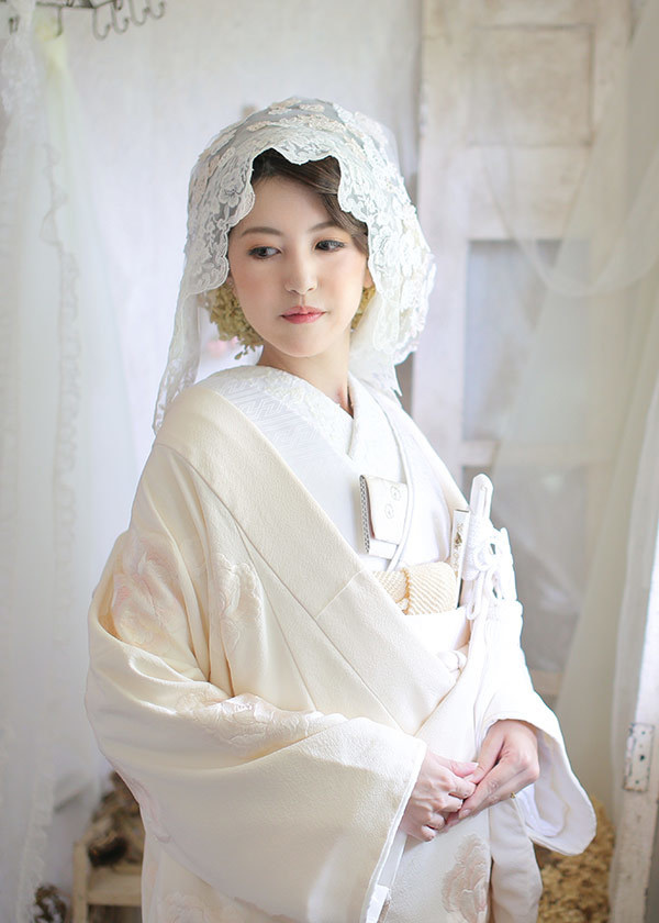 綿帽子風のレースのベールや、レースを重ねた半衿を合わせて、洋風にアレンジ。ヘアはサイドをゆるく編み込んだちょっとクラシカルなスタイルが似合います。