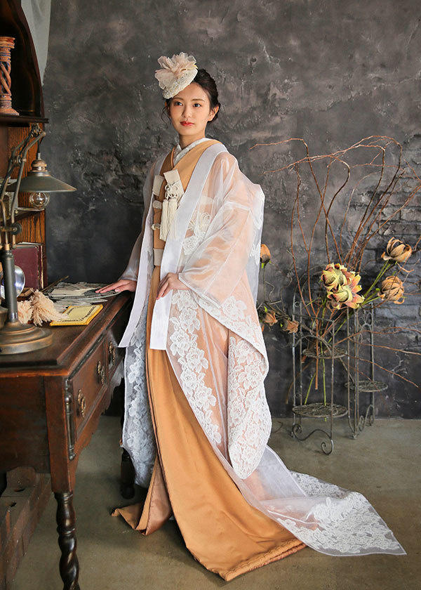白のオーガンジー打掛にアンバー(琥珀色)の掛下を合わせた大人っぽいコーディネート。小物はベージュでまとめて、シックでおしゃれな印象に。打掛の透け感とレースのようなバラ柄でフェミニンな装いを楽しめます。