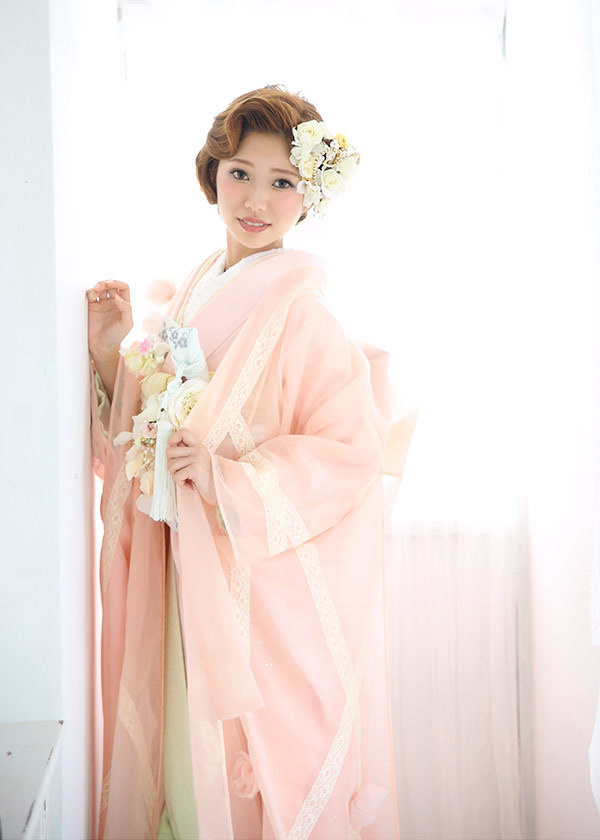 ピンクのオーガンジー打掛に淡いグリーンの掛下を合わせた、フェミニンなコーディネート。