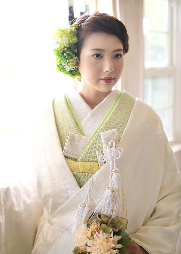 若草色の疋田(ひった)模様の色掛下(白無垢の下に着る着物)を合わせたコーディネート。若々しくナチュラルな雰囲気で、洋風な会場にも合います。