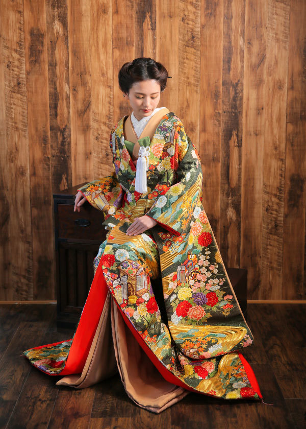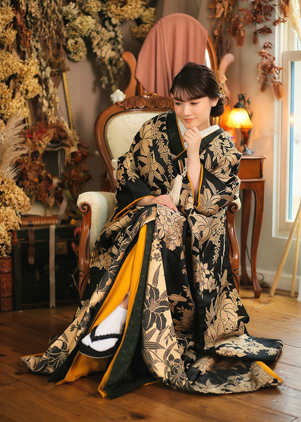黒は何色にも染まらないことから、「あなた以外の色には染まりません」という意味を持ち、古くから婚礼に使われた黒の着物。