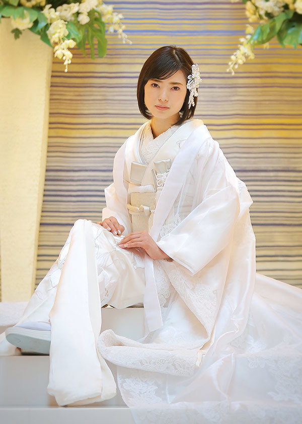 純白のオーガンジー打掛を白やシルバーの小物でまとめたコーディネート。ヘアやブーケのアレンジも自在で、どんな会場にも合います。